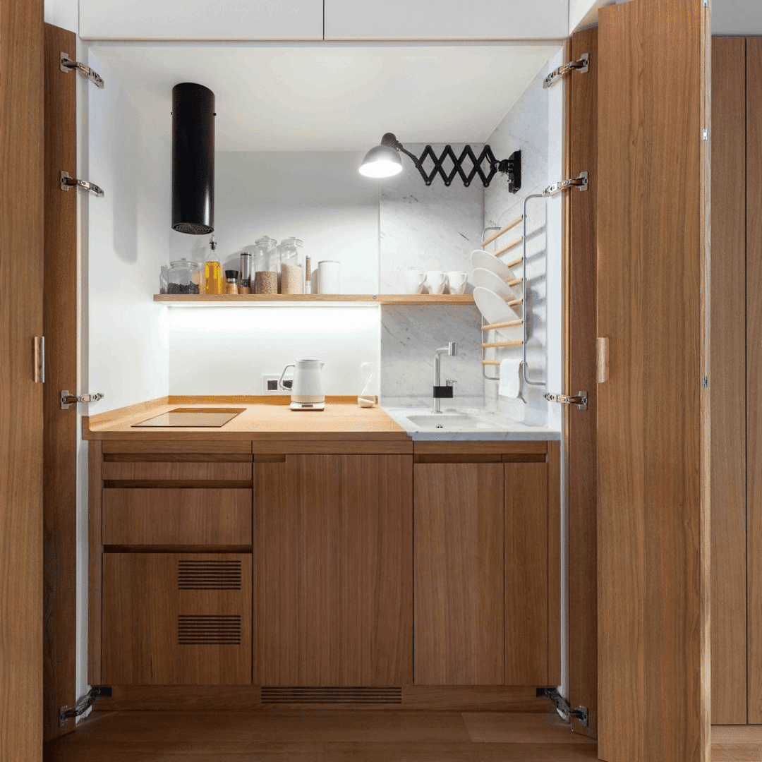 A algunos propietarios no les gusta tener la cocina y los electrodomésticos a la vista, ya sea por gusto personal o porque va en contra de la estética minimalista y elegante por la que han optado. La solución es diseñar una cocina compacta y oculta que se pueda ocultar fácilmente y que se integre con el resto del diseño interior.