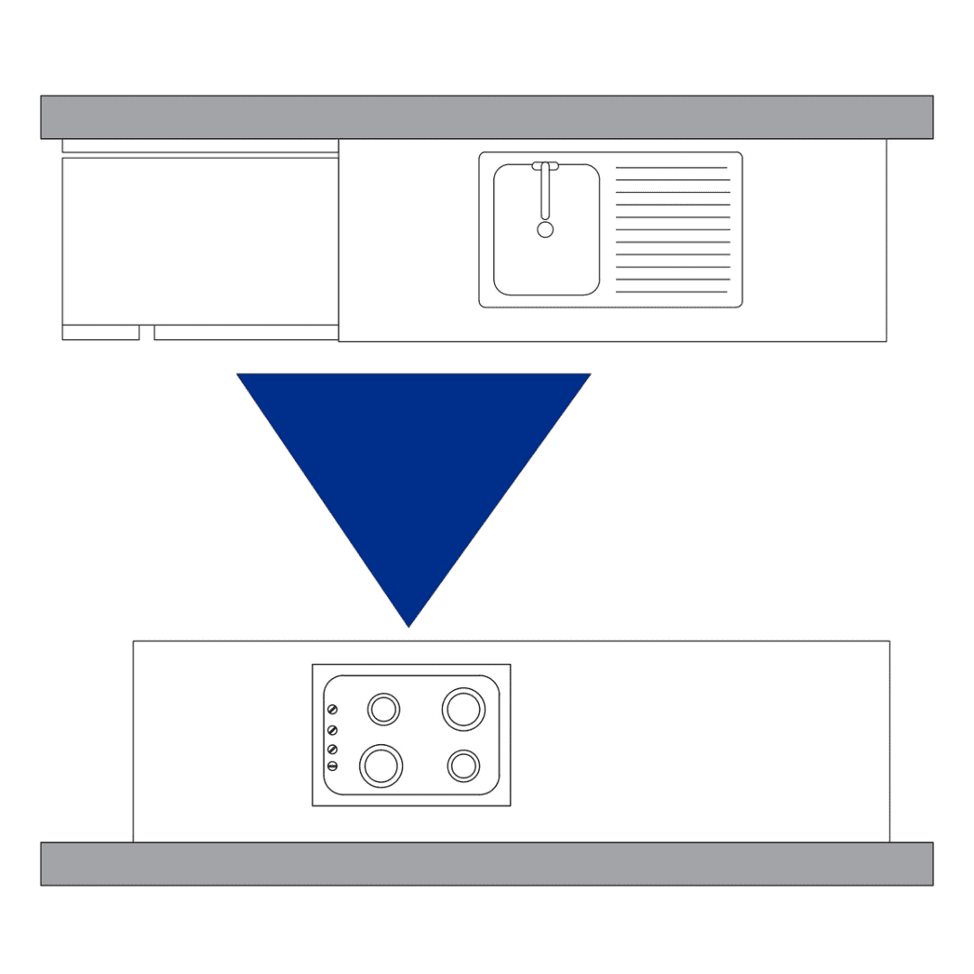 Varios estudios han definido 5 áreas generales en una cocina: el área de la despensa, que incluye el espacio de almacenamiento de alimentos, productos enlatados y el refrigerador, el área de almacenamiento, que incluye electrodomésticos, utensilios de cocina, el fregadero, el área de preparación y el área de cocción, que incluye la cocina y el horno. Tradicionalmente, las cocinas deben seguir el concepto de triángulo de trabajo, que asegura que las tareas principales realizadas entre el refrigerador, el lavadero y el horno deben estar conectadas por una línea imaginaria de tres puntos. Este triángulo permite a los residentes moverse por estas funciones principales con un tráfico mínimo y una eficiencia máxima.