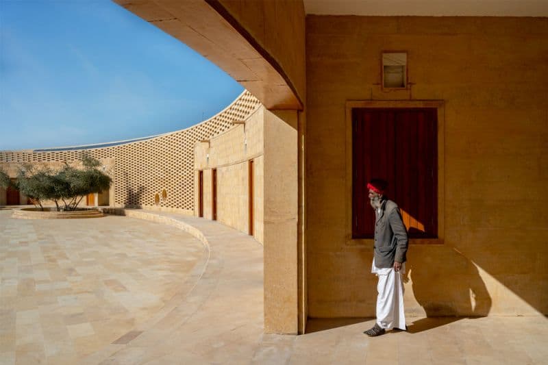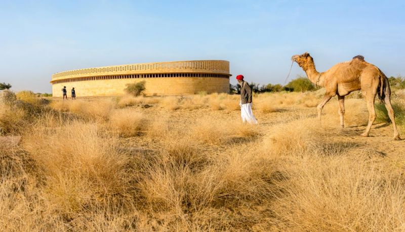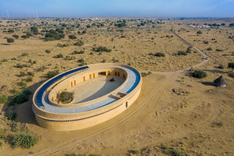 Situado en las dunas del desierto indio del Thar y cerca de la Ciudad Dorada de Jaisalmer, emerge un poético edificio ovalado construido con arenisca, obra de la arquitecta norteamericana Diana Kellogg con estudio en la ciudad de Nueva York.