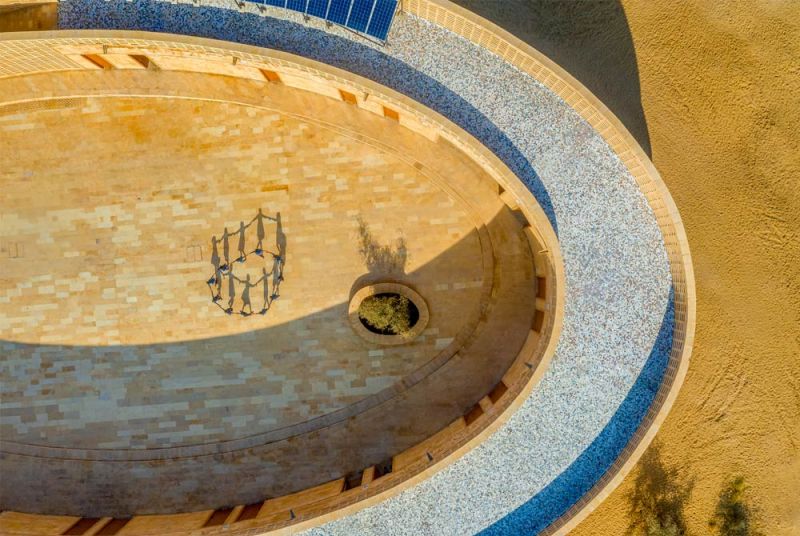 Por consiguiente, las formas curvas del moderno edificio de la escuela se funden con las dunas del desierto y a la vez se integran con el paisaje, la cultura y la historia del país.